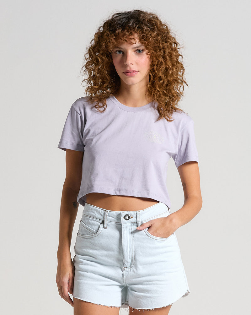Camiseta Volcom Stoneshine. Possui modelagem cropped e estampa em silk frontal e nas costas.