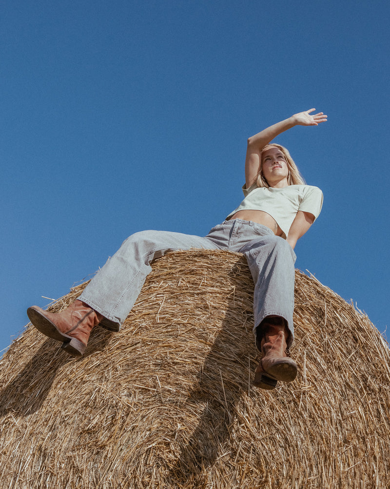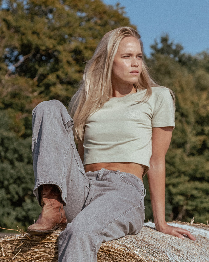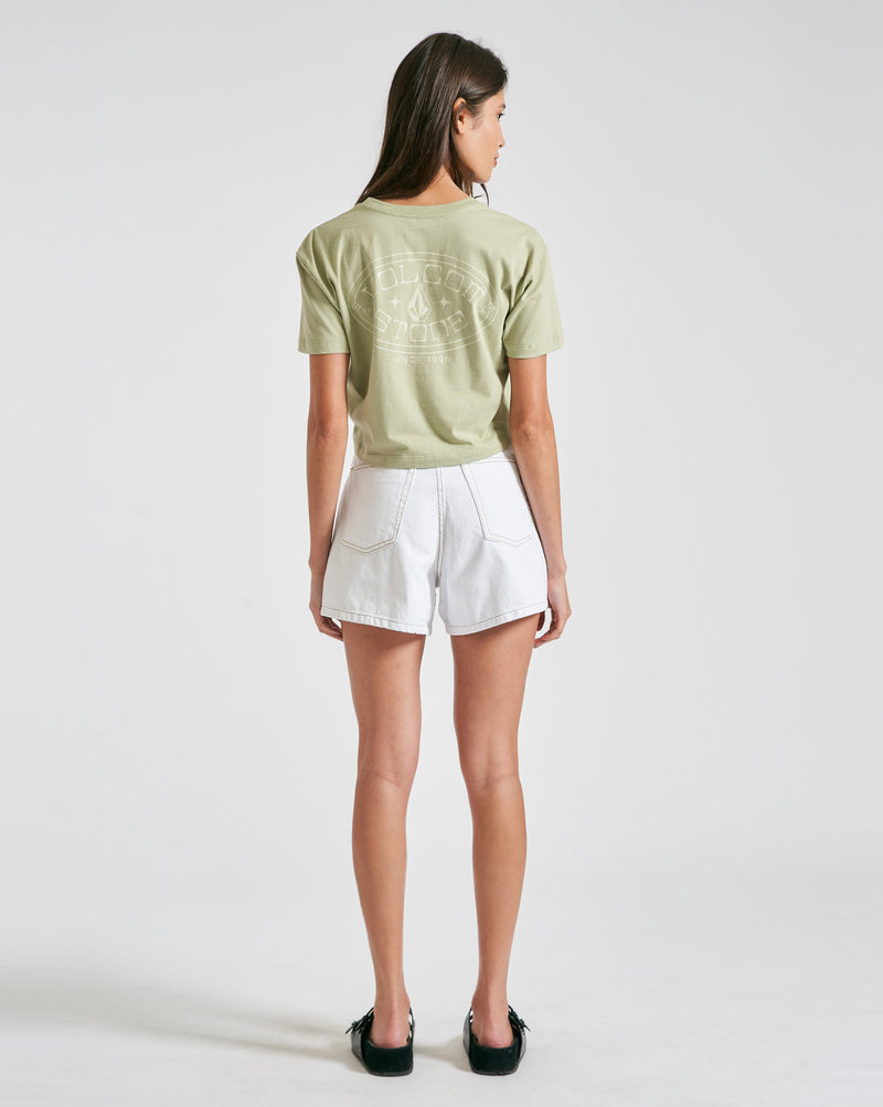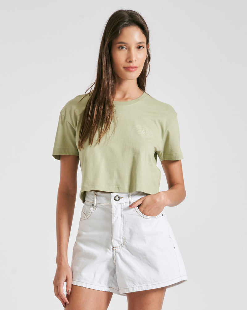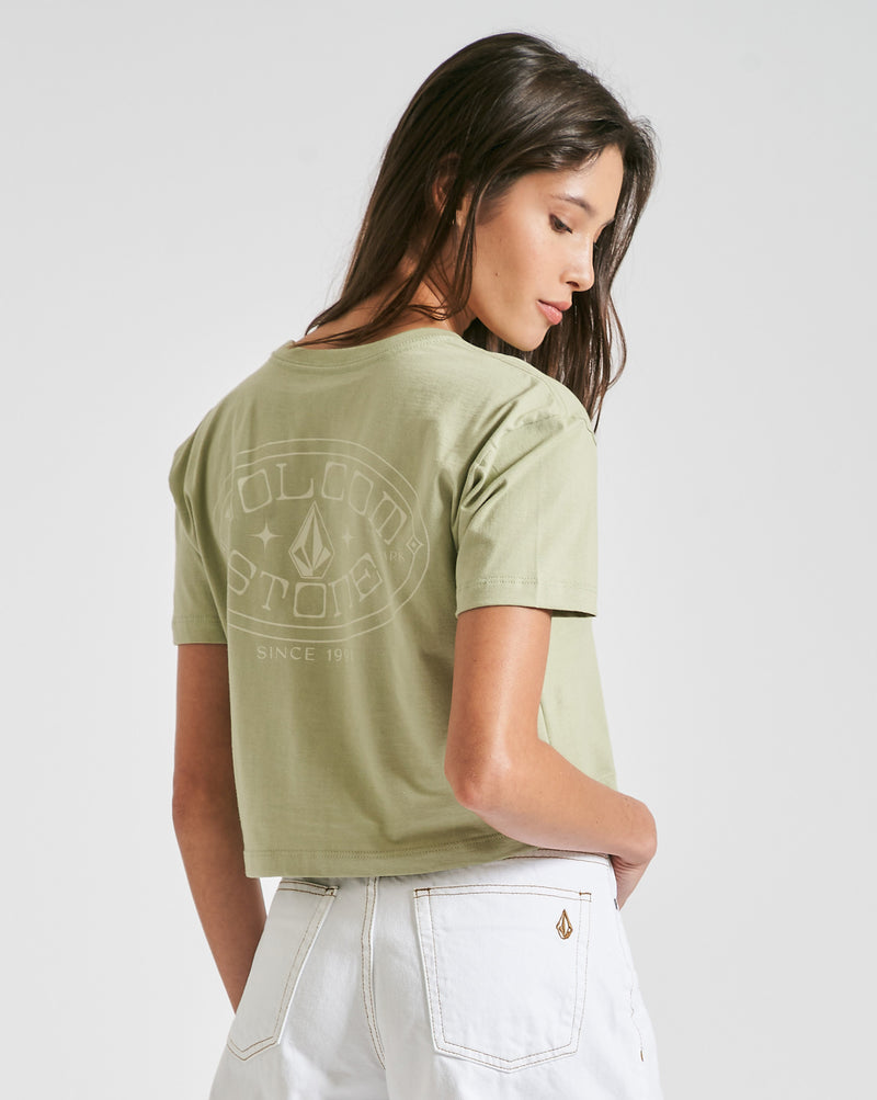 Camiseta Volcom Stoneshine. Possui modelagem cropped e estampa em silk frontal e nas costas.