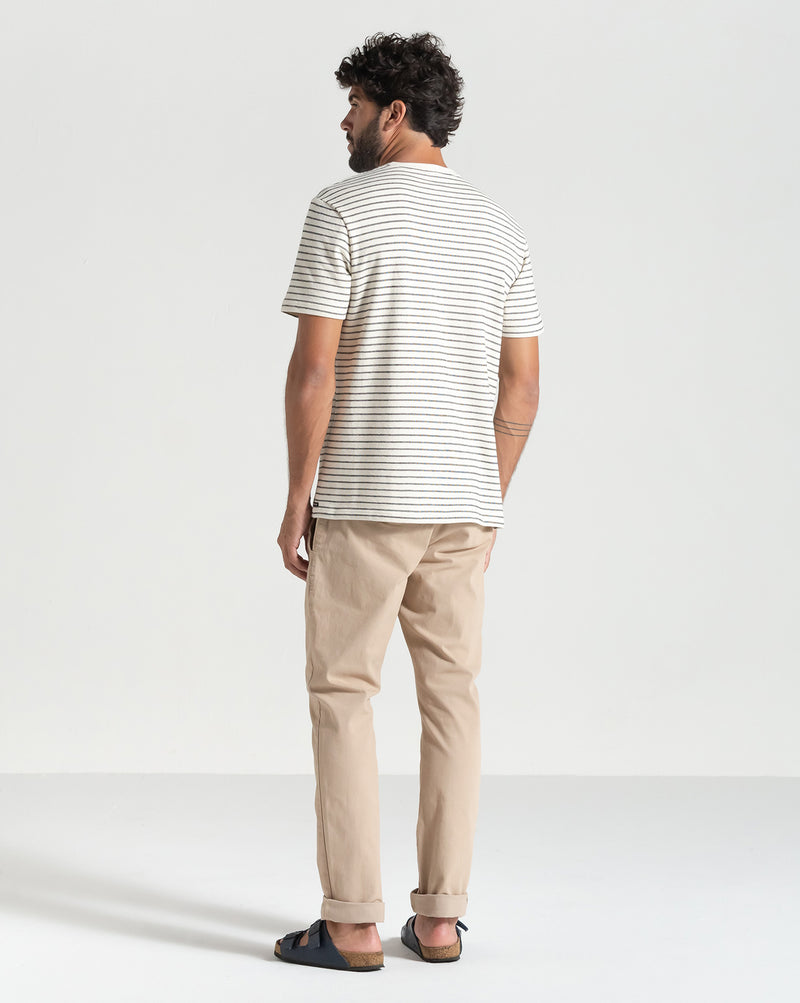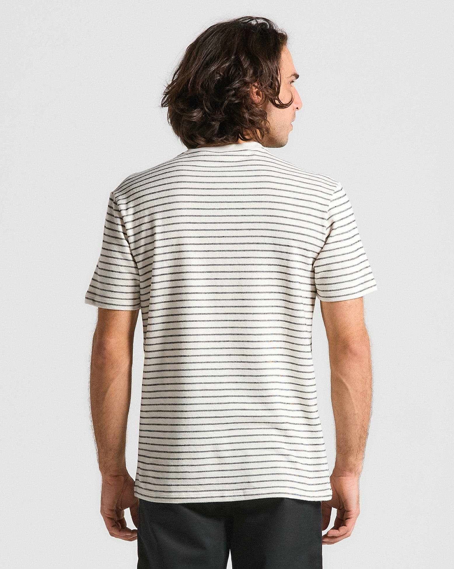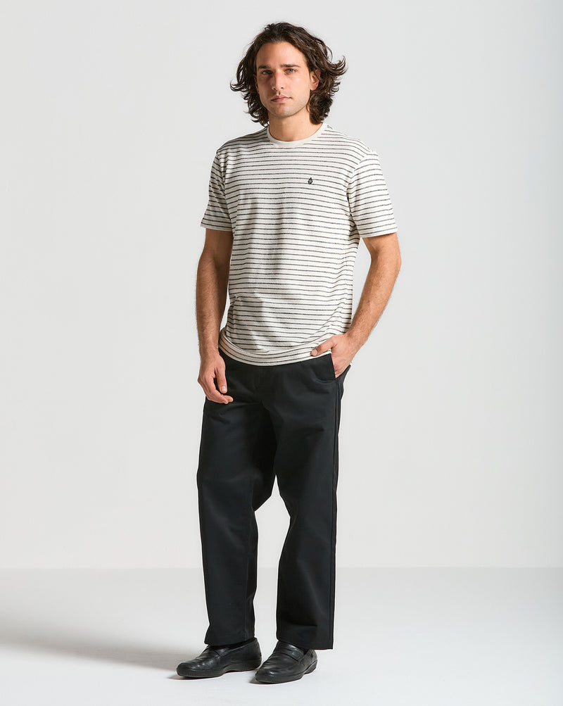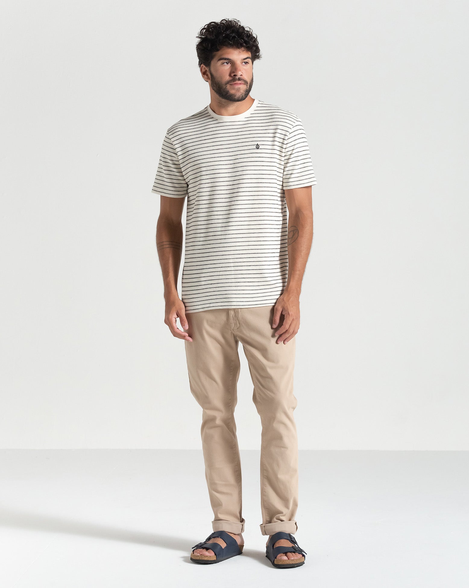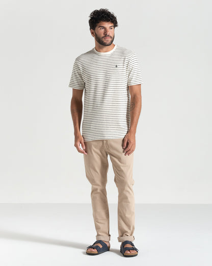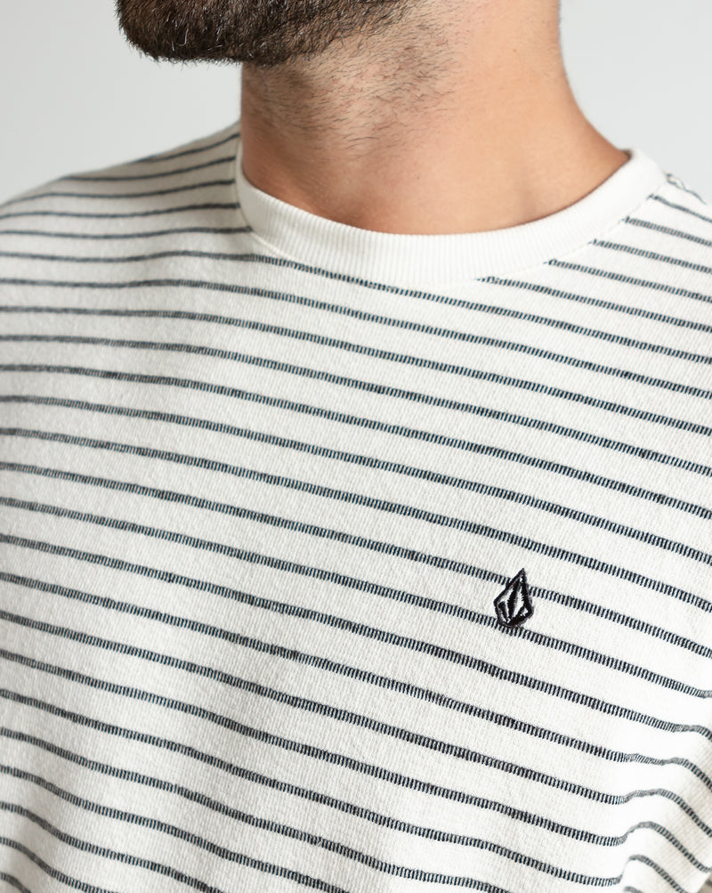 Camiseta Volcom Swipestone. Possui modelagem regular, bordado Volcom Stone frontal, listras em tecido maquinetado e viés interno do próprio tecido.