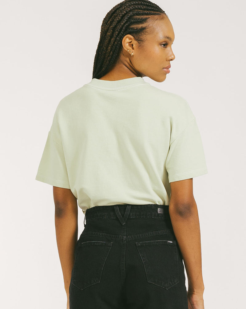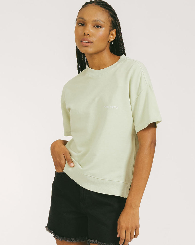 Camiseta Volcom Truly Stoked. Possui modelagem relaxed cropped, bordado Volcom frontal e lavanderia efeito estonado.