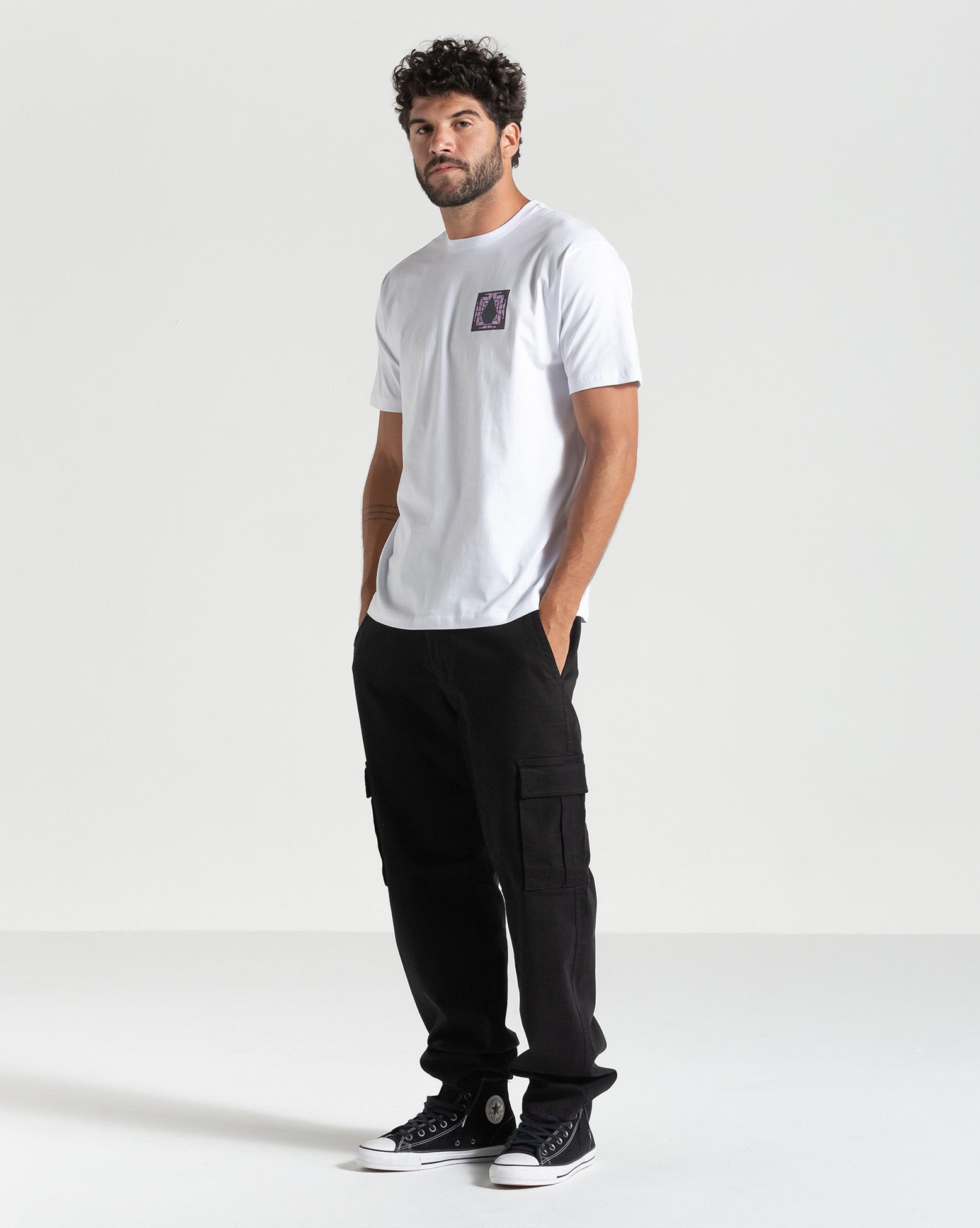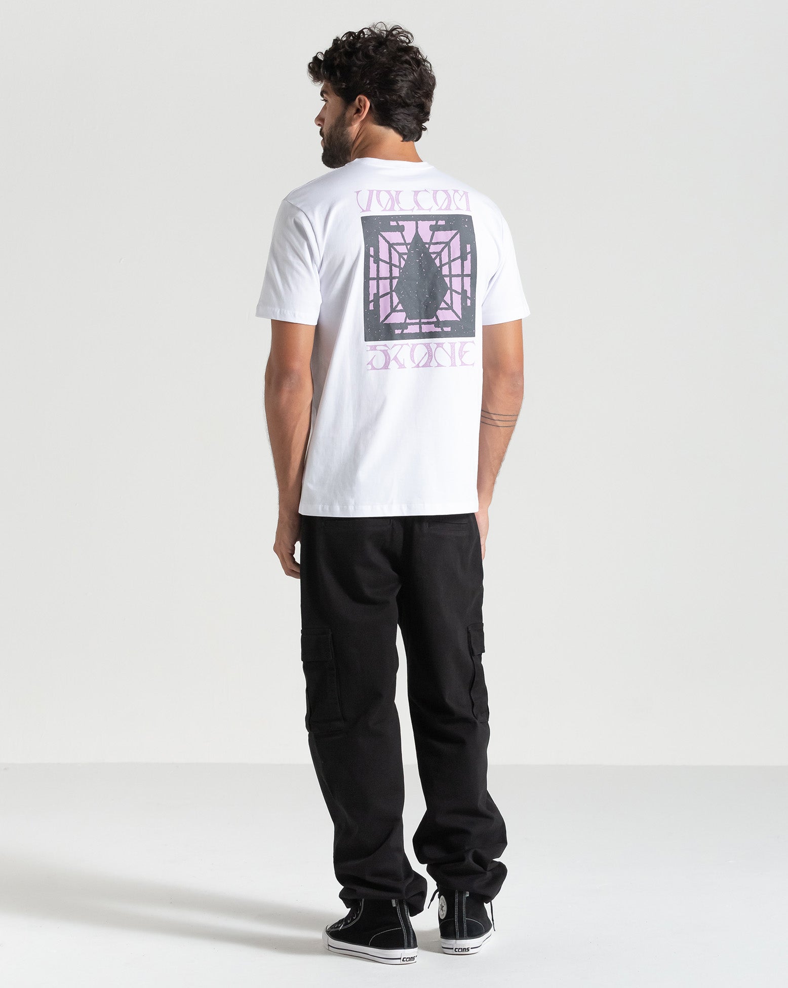 Camiseta Volcom Within. Possui modelagem regular, estampa em silk frontal e nas costas, assinatura Volcom na manga, etiqueta interna e viés contrastante.