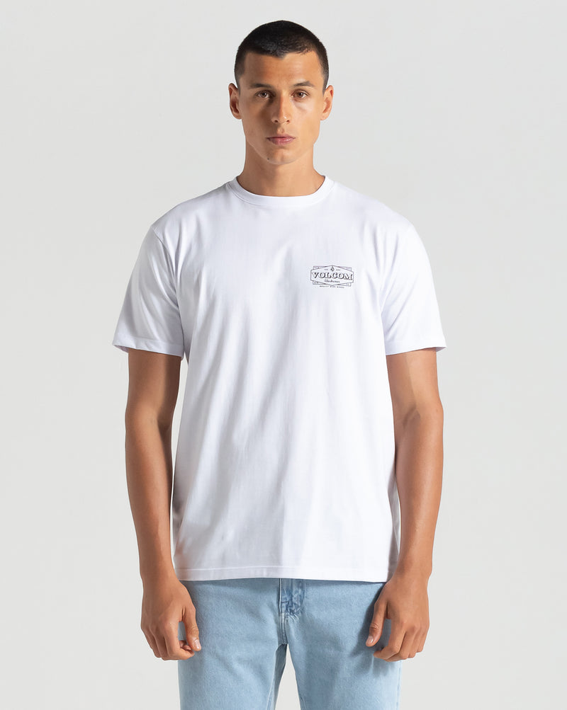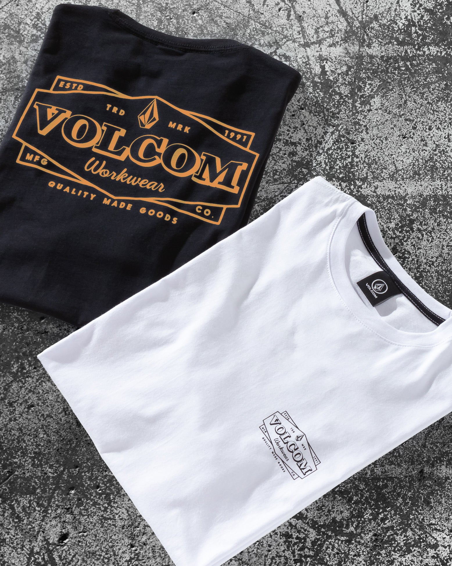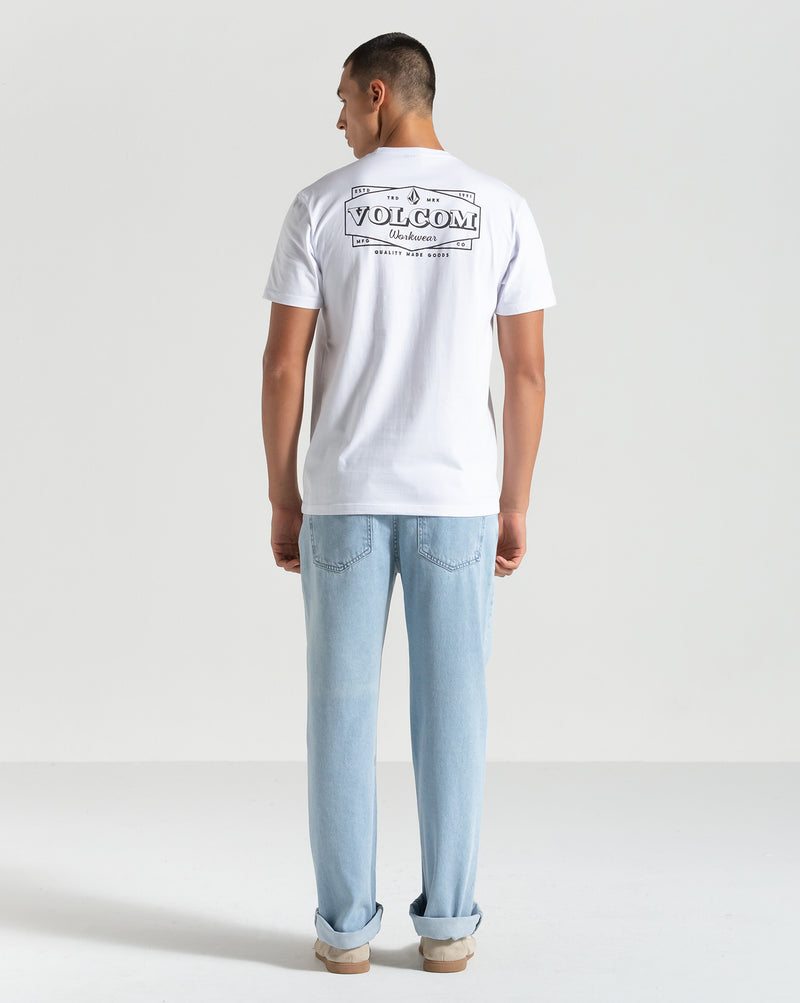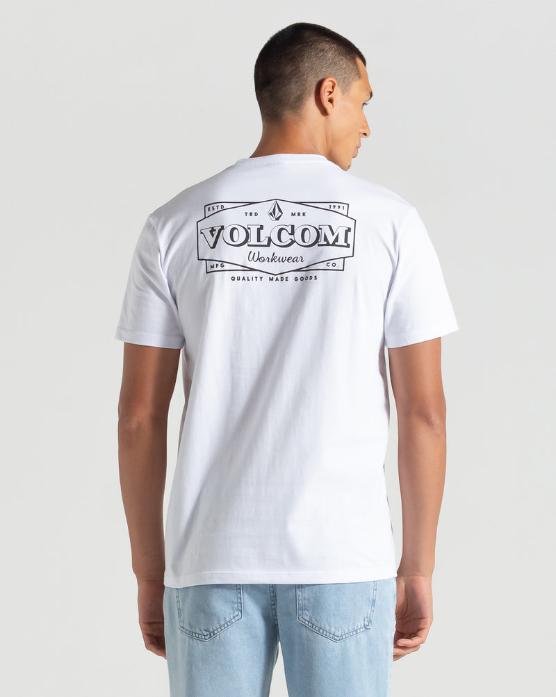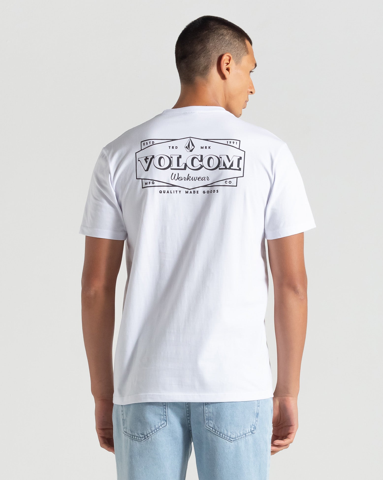 Volcom Workwear: quality made, durable goods. Camiseta Volcom Workwear Union. Possui modelagem regular, estampa em silk frontal e nas costas, assinatura Volcom na manga, etiqueta interna e viés contrastante.
