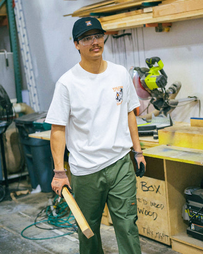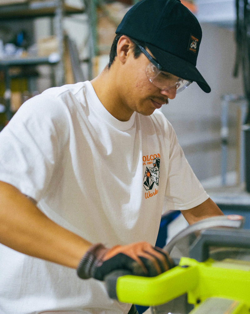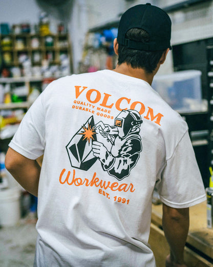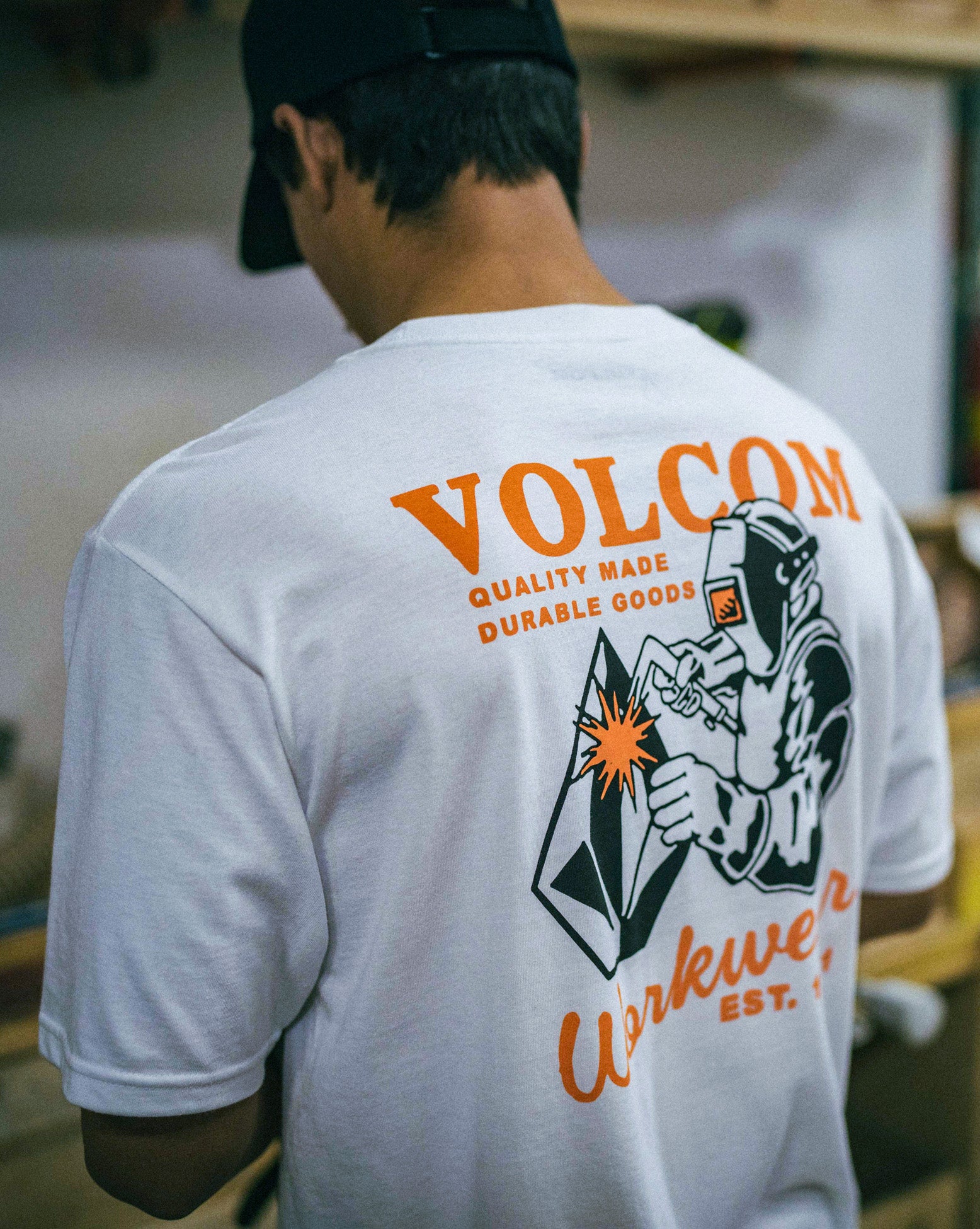 Volcom Workwear: quality made, durable goods. Camiseta Volcom Workwear Welder. Possui modelagem regular, estampa em silk frontal e nas costas, assinatura Volcom na manga, etiqueta interna e viés contrastante.
