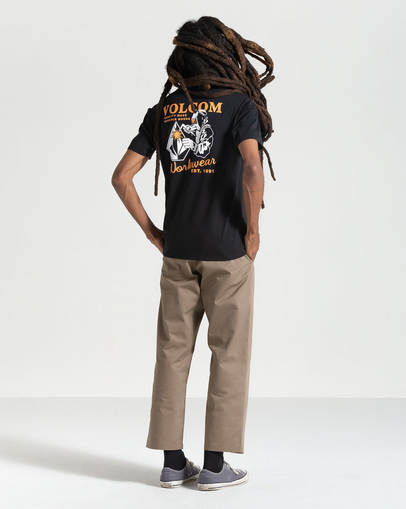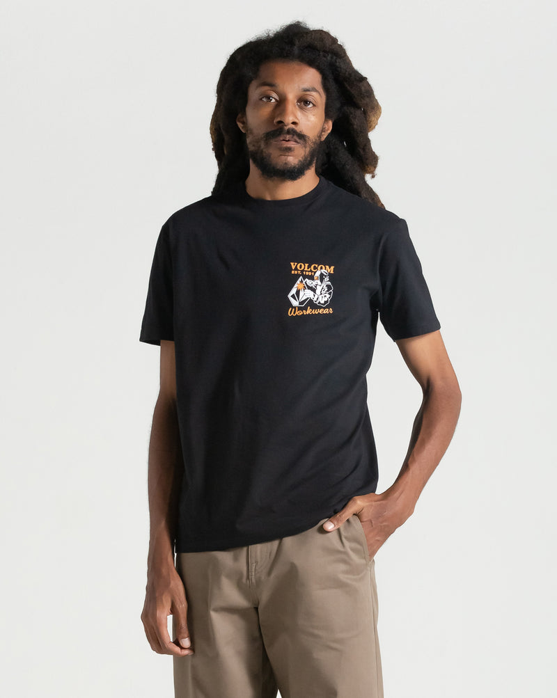 Volcom Workwear: quality made, durable goods. Camiseta Volcom Workwear Welder. Possui modelagem regular, estampa em silk frontal e nas costas, assinatura Volcom na manga, etiqueta interna e viés contrastante.