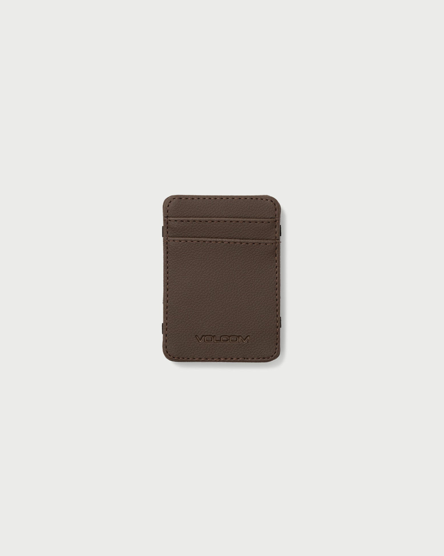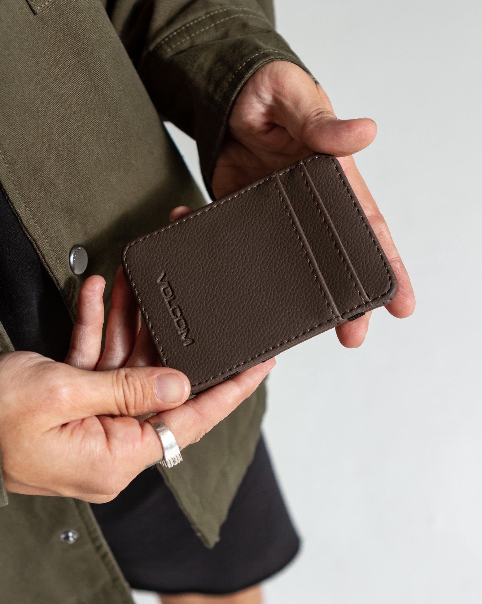 Carteira Volcom Magic Stone. Possui metal Volcom frontal, divisão interna para cartões, dinheiro, documento e moeda e assinatura Volcom interna em baixo relevo.