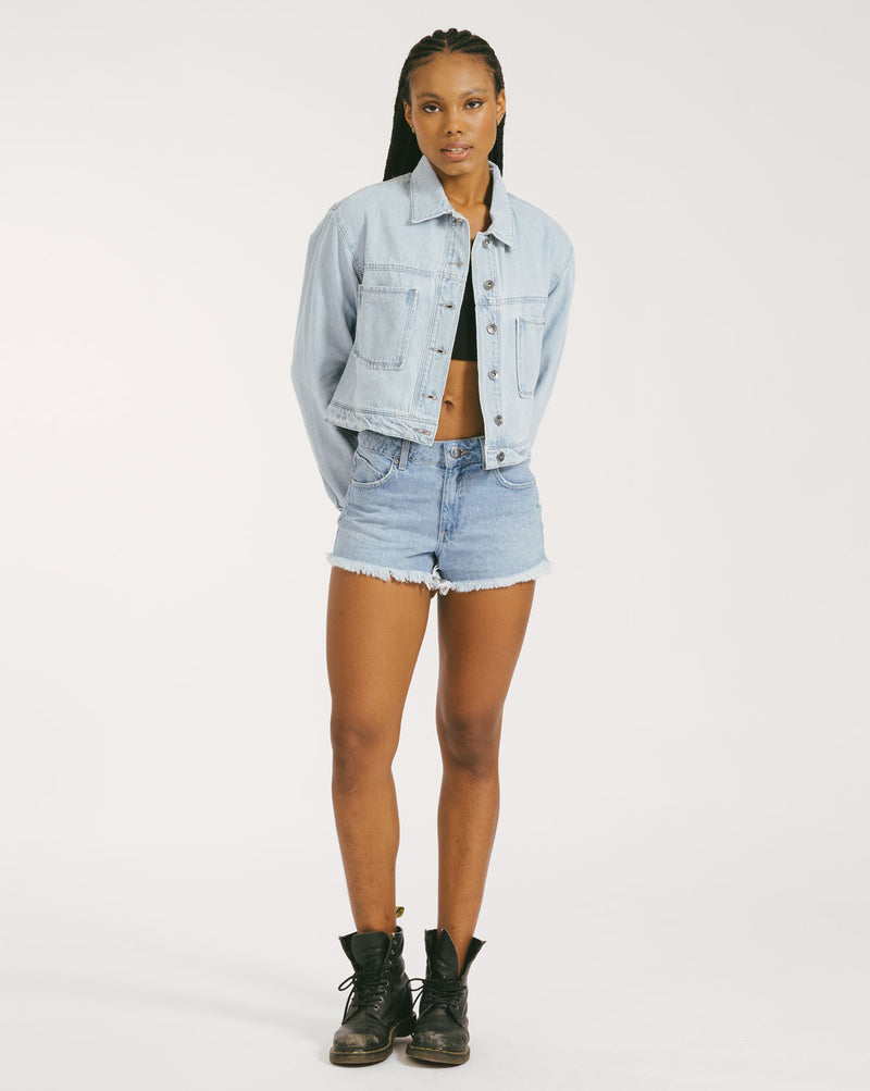 Jaqueta Jeans Volcom Blue Stone. Possui modelagem cropped relaxed, fechamento em botão, bordado Volcom Stone nas costas, patch Volcom no cós traseiro, etiqueta Volcom frontal e lavanderia amaciada com efeito used. Confeccionada em tecido poliéster.