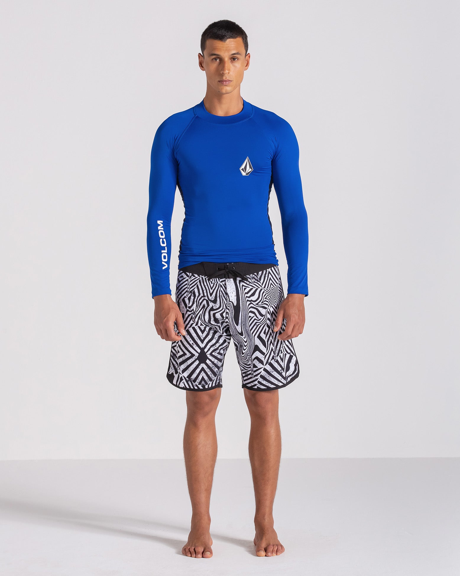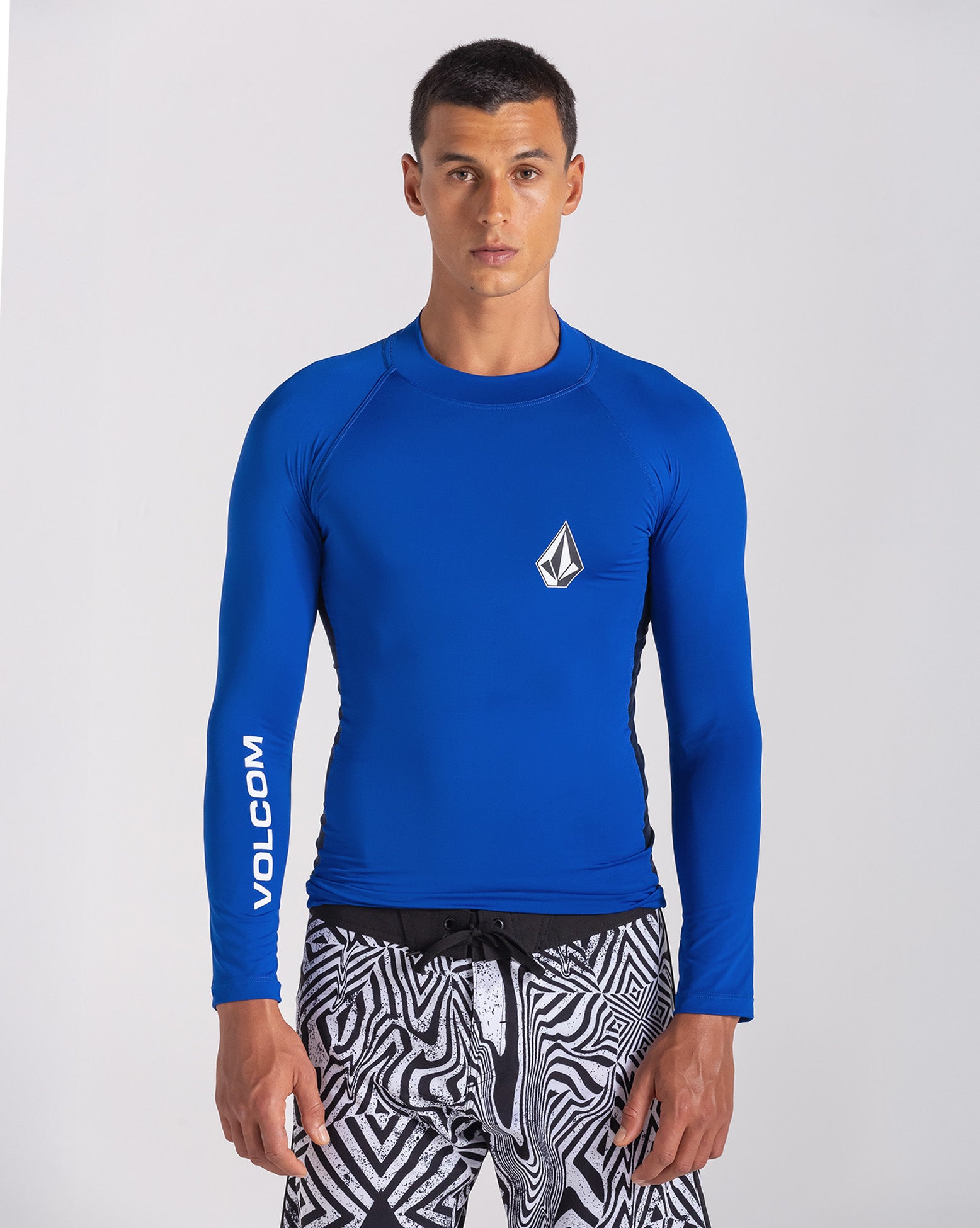 Lycra Volcom Lido Solid Azul Manga Longa. Possui modelagem ajustada, silk Volcom Stone frontal, silk Volcom na manga, detalhe contrastante nas mangas e laterais e proteção UV 50+.