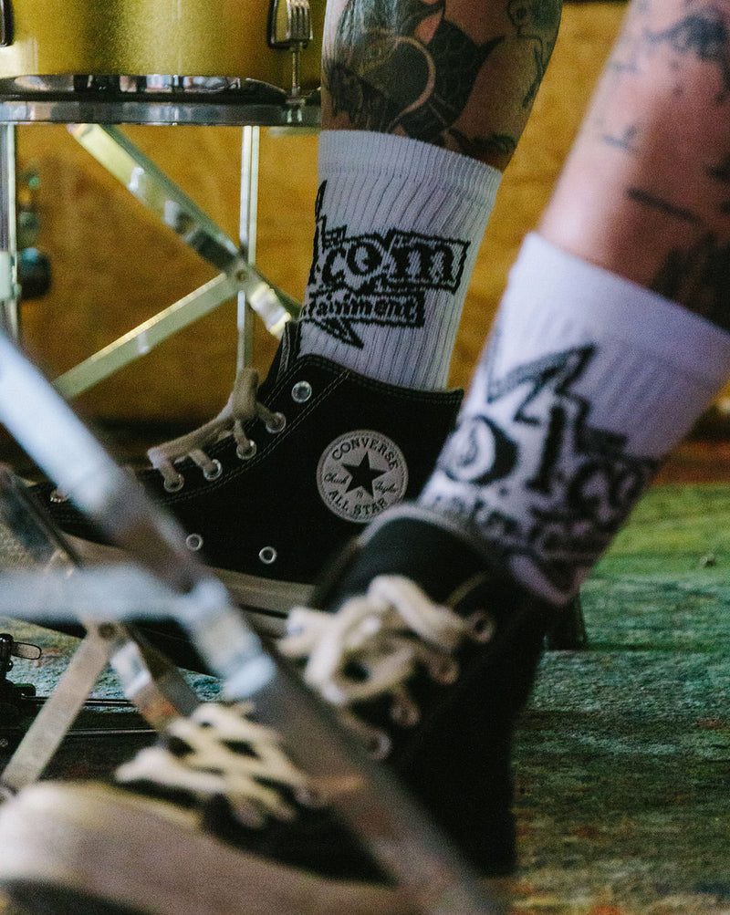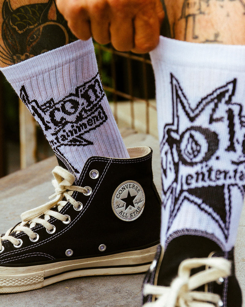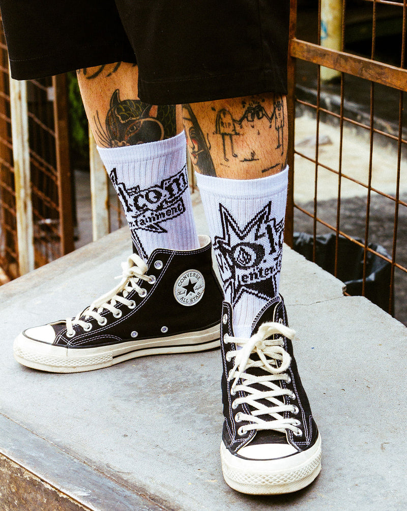 Com estampa do clássico logotipo do selo de música Volcom Entertainment, estas meias incorporam nosso amor pela música, pela arte, pelo cinema e pelo entretenimento.