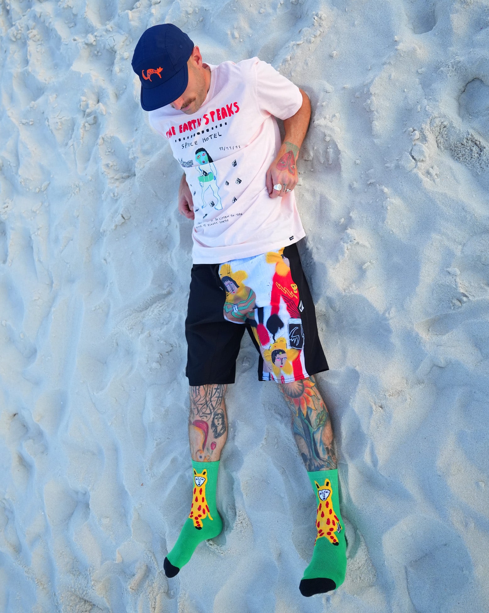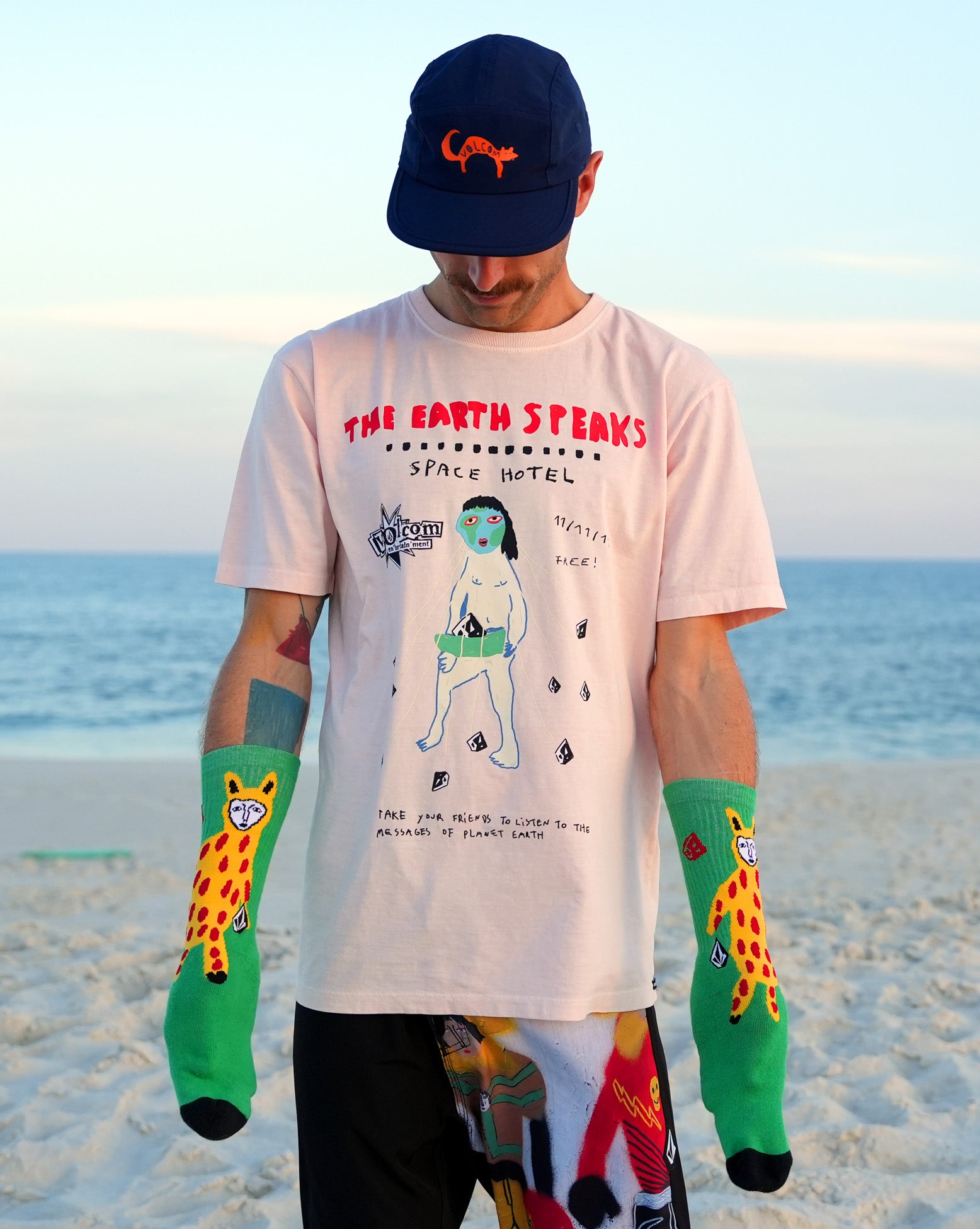 Meia Volcom Featured Artist Series x Alucinandinho Leopard Verde. Fernando Winck Ziliotto, mais conhecido como Alucinandinho, é artista e surfista local da Praia do Matadeiro, em Florianópolis. A Volcom Brasil, orgulhosamente, apresenta a sua primeira coleção!