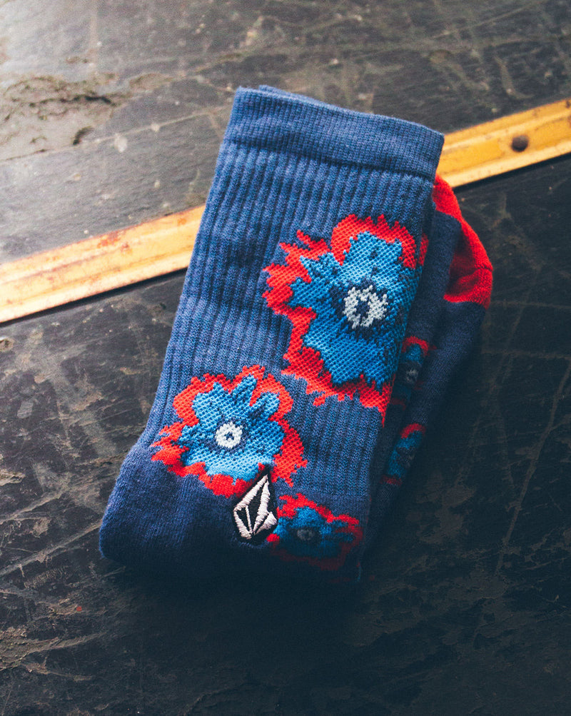 Meia Volcom Flower. Possui modelo cano alto, arte em jacquard e o clássico bordado Volcom Stone.