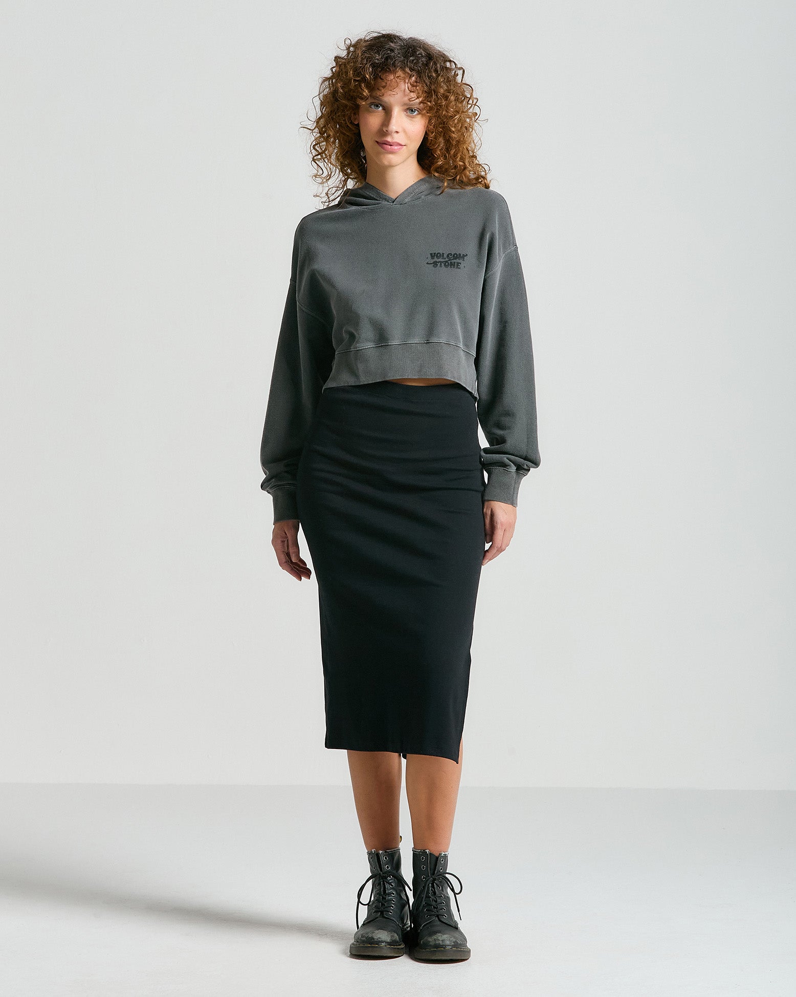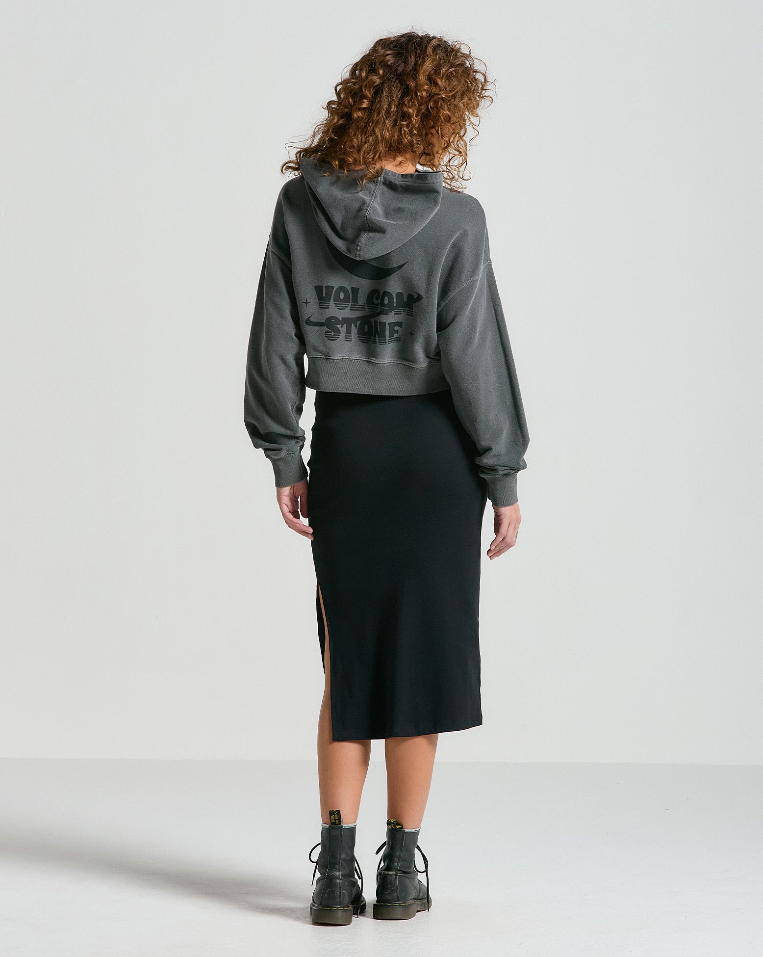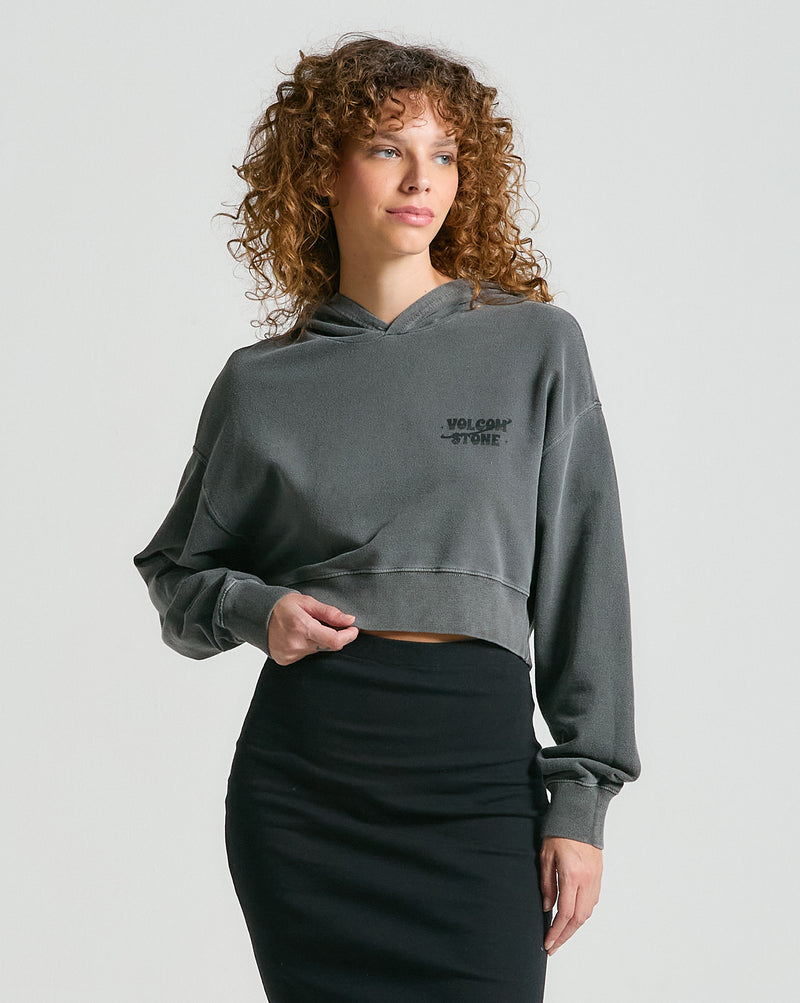Moletom Volcom Good In Hour. Possui modelagem cropped oversized, estampa em silk frontal e nas costas e lavanderia efeito estonado.