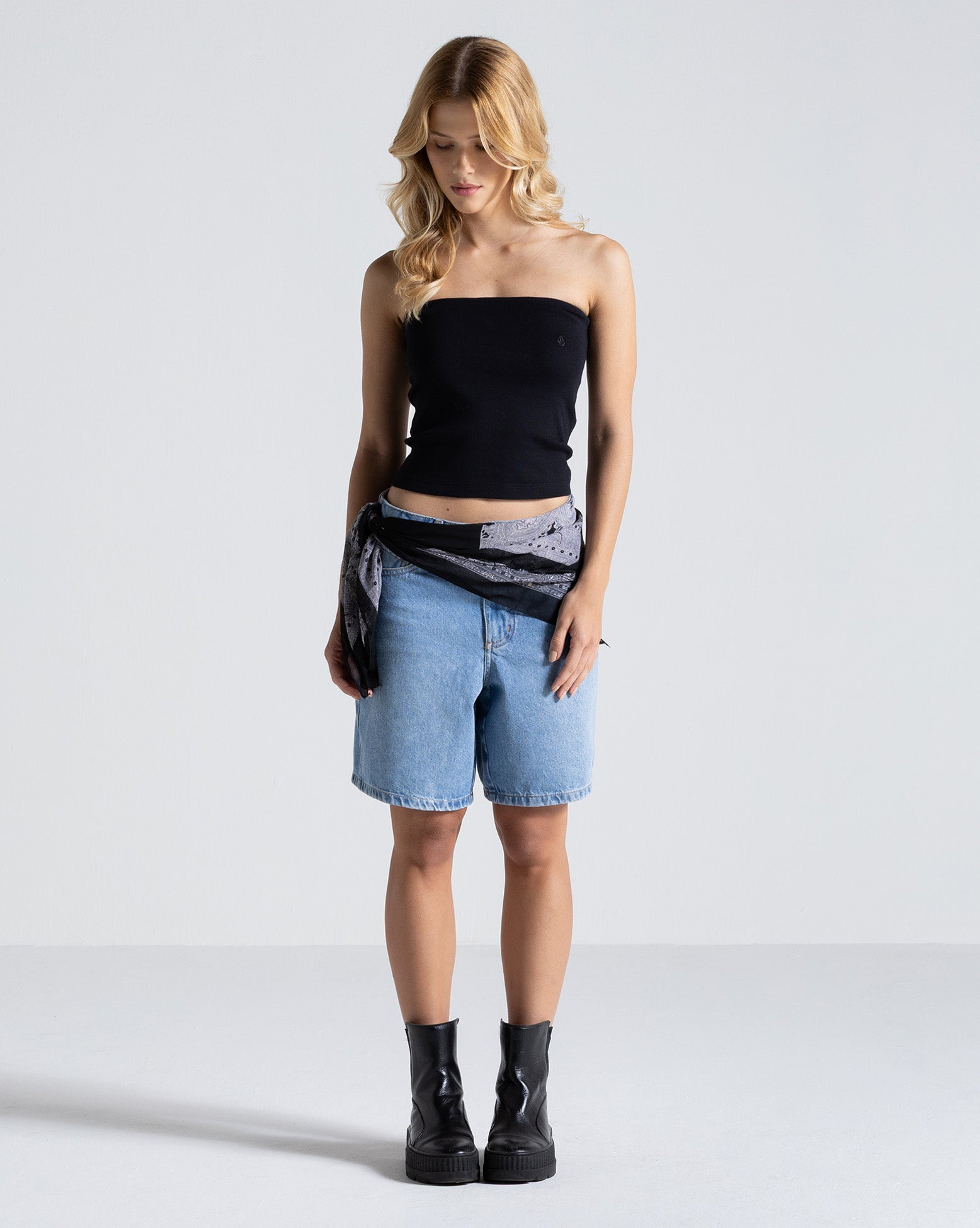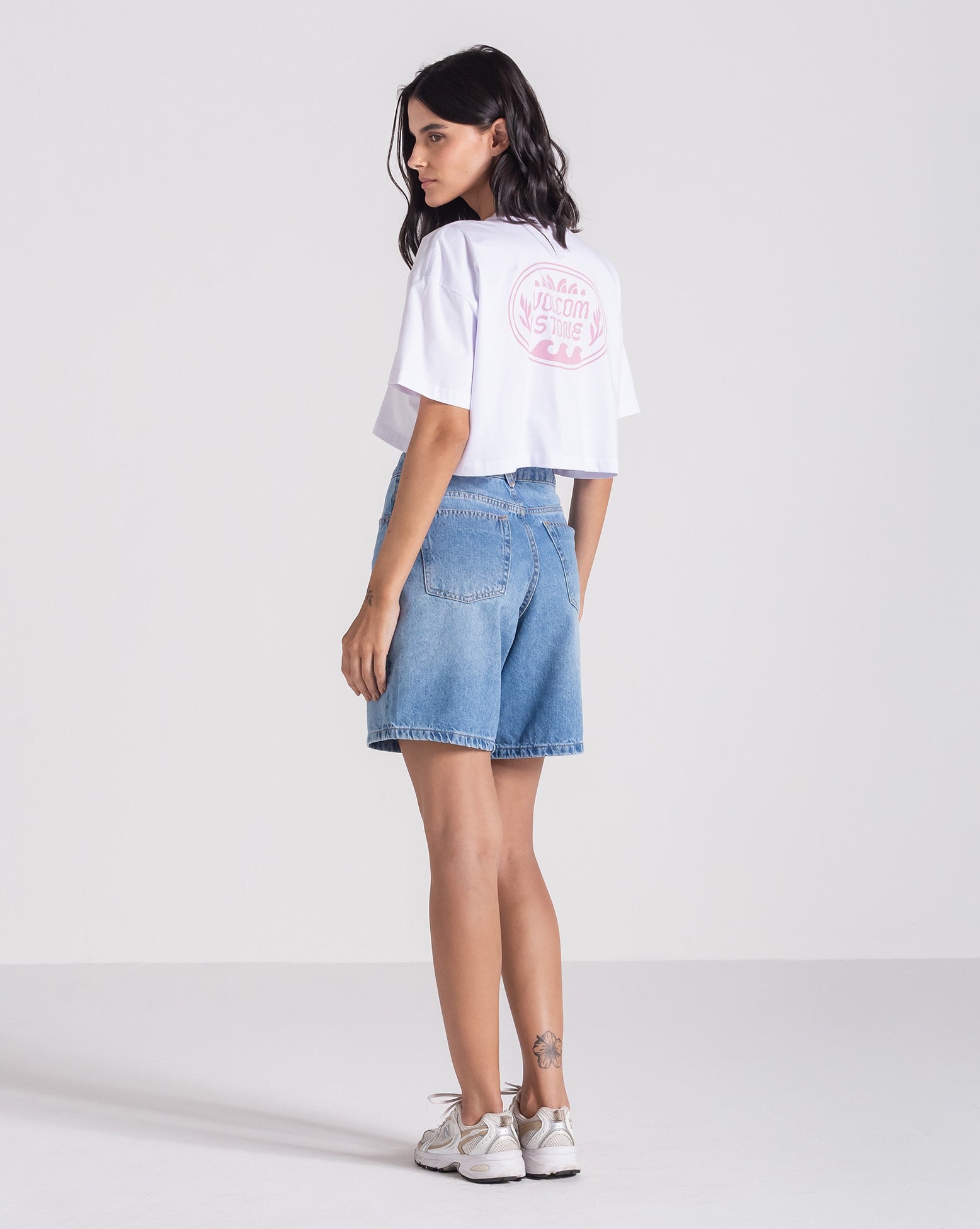 Shorts Volcom Straipup Long Jeans. Possui modelagem alta relaxed, patch Volcom no cós traseiro, bordado Volcom Stone no bolso e lavanderia amaciada + efeito used.