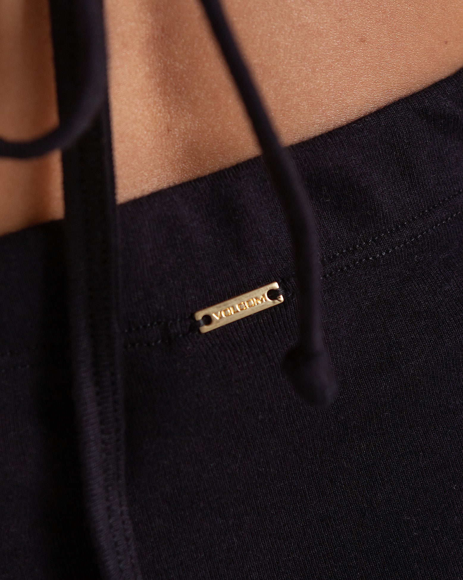 Vestido Volcom Backless Preto. Modelagem ajustada, comprimento midi, decote nas costas com detalhe em amarração e plaquinha de metal Volcom.