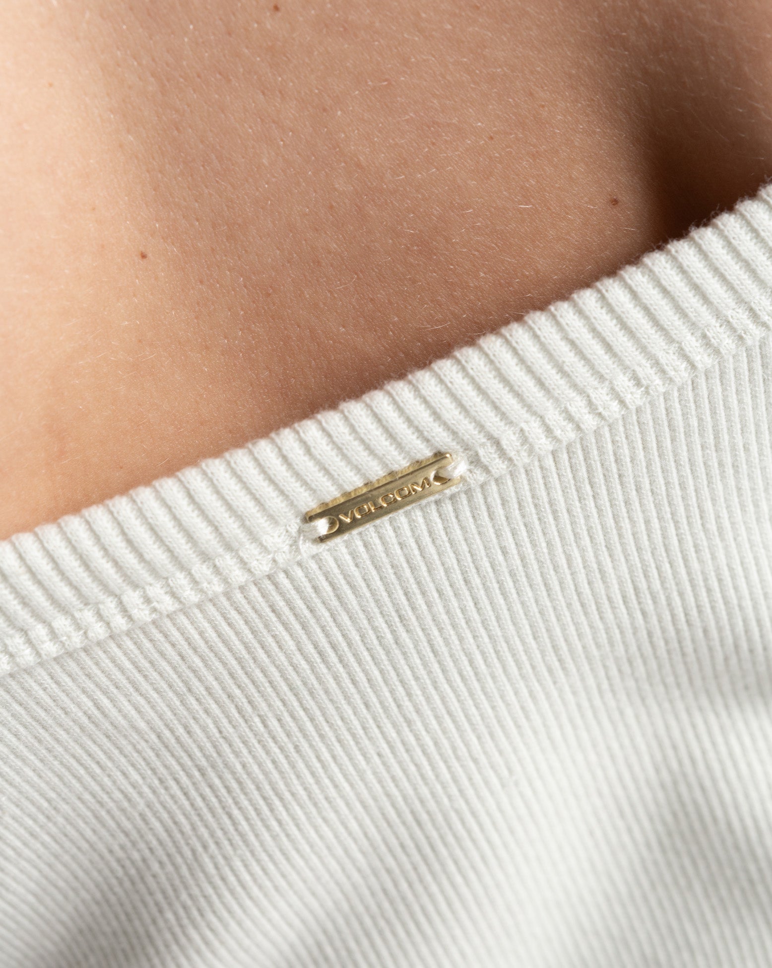 Vestido Volcom Gurrl Gang Off White. Modelagem ajustada, decote reto e plaquinha de metal Volcom