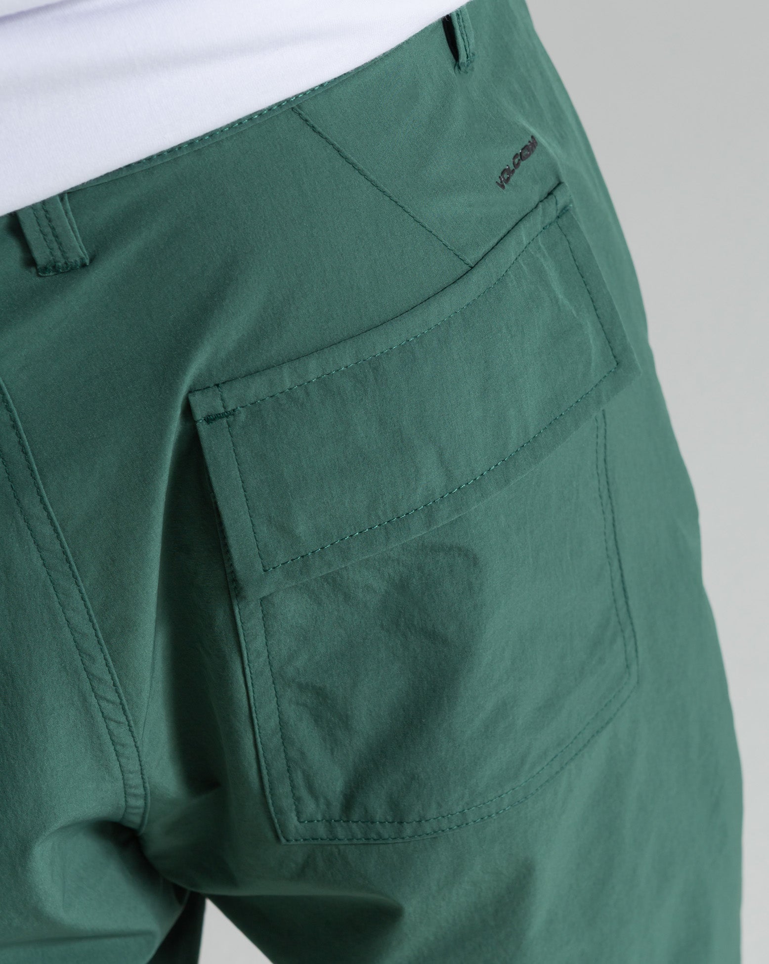Walkshort Híbrido Volcom Joy Thriller Hybrid Alpine Green. Possui 19” de comprimento, bolso faca lateral, bolso com fechamento invisível, botão de fivela reciclado, etiqueta Volcom frontal, Volcom Stone em alto relevo na perna, Volcom em alto relevo no bolso traseiro e fechamento do bolso traseiro em velcro.