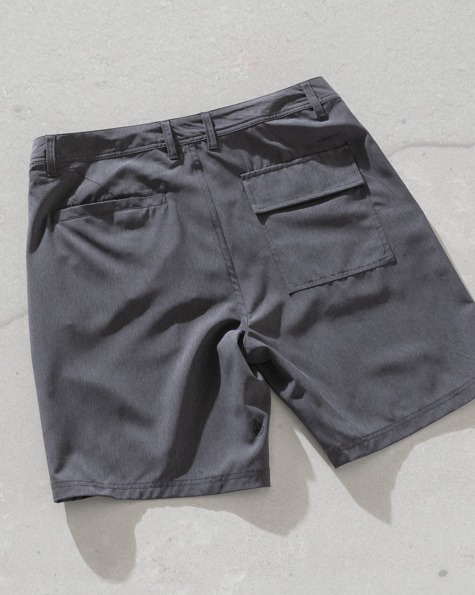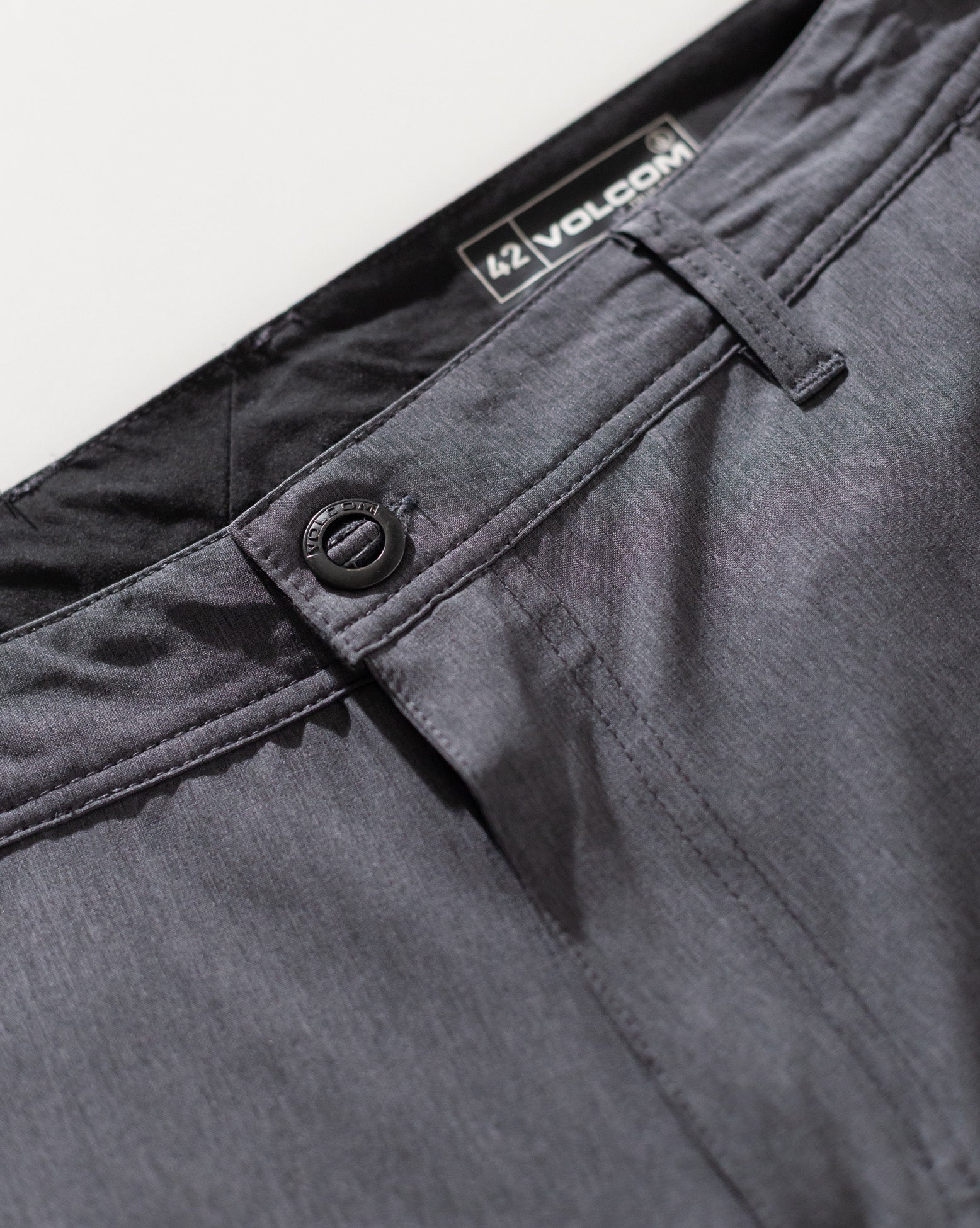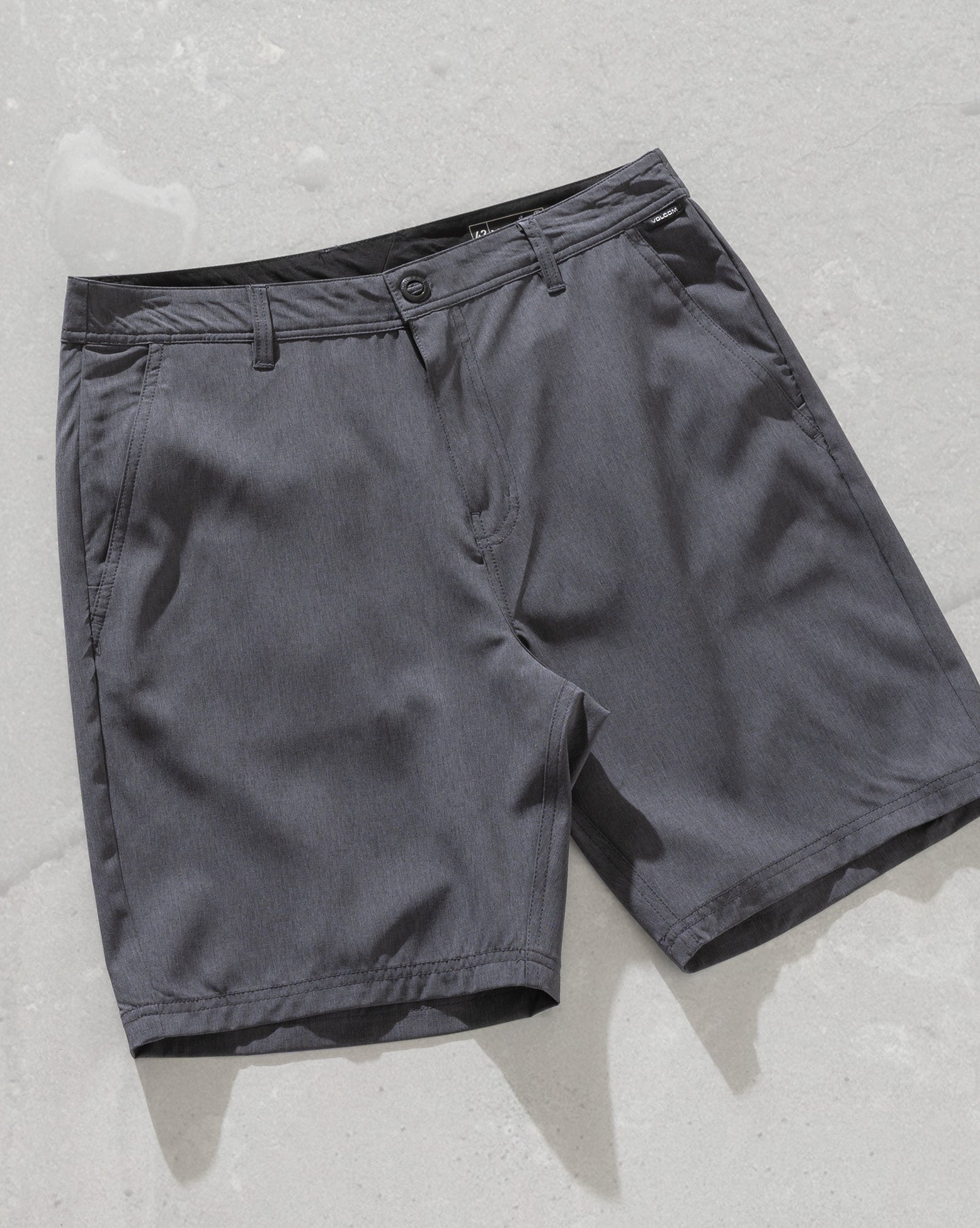 Walkshort Híbrido Volcom Thriller Hybrid Black Heather. Possui 19” de comprimento, bolso faca lateral, bolso com fechamento invisível, botão de fivela reciclado, etiqueta Volcom frontal, Volcom Stone em alto relevo na perna, Volcom em alto relevo no bolso traseiro e fechamento do bolso traseiro em velcro.