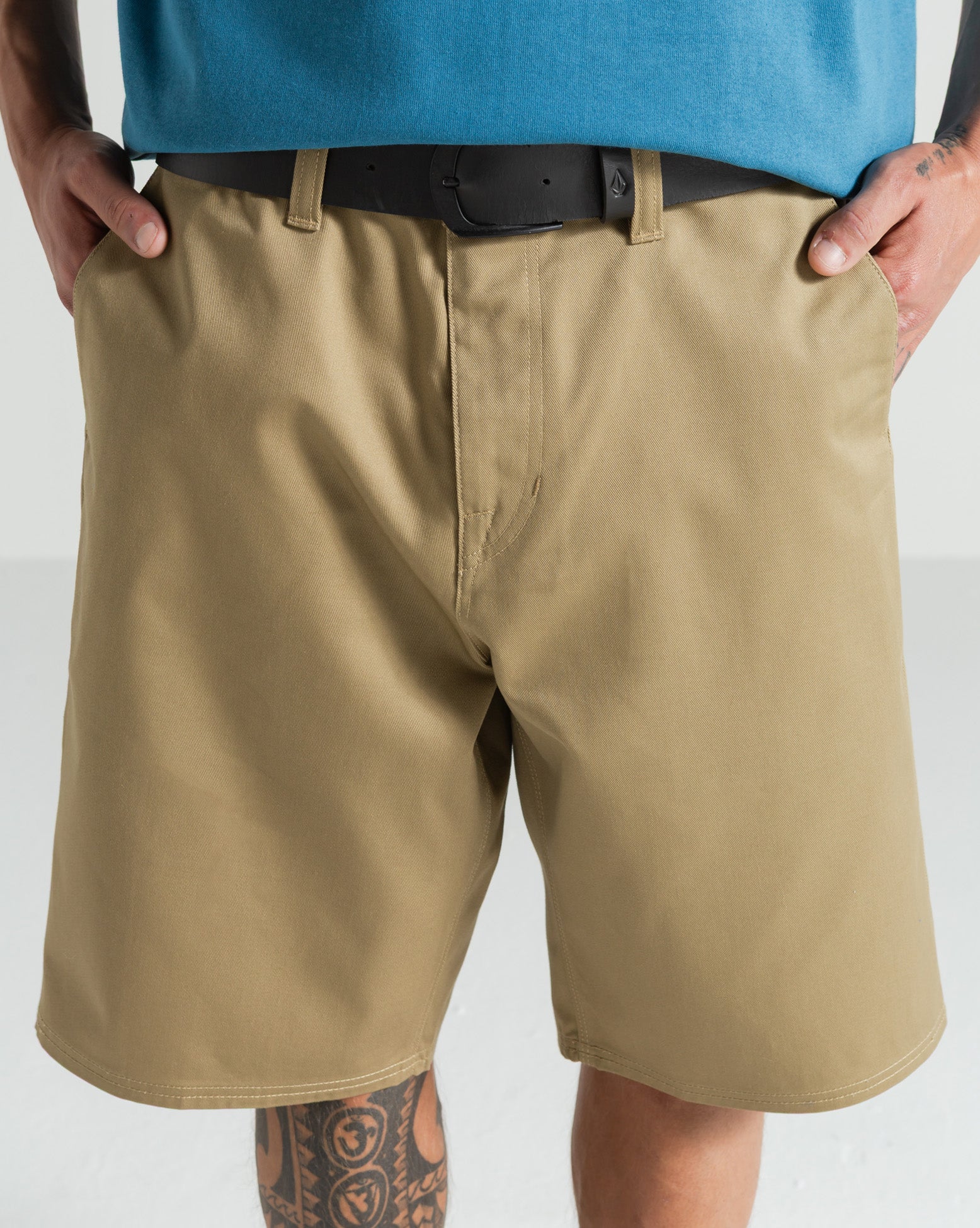 Walkshort Volcom Frickin Chino Dark Khaki. Possui 22” de comprimento, bolso faca lateral, bolso lateral embutido, bolso traseiro embutido, botão indestrutível, pala traseira assimétrica, bordado Volcom Stone na perna e bordado Volcom no bolso traseiro.